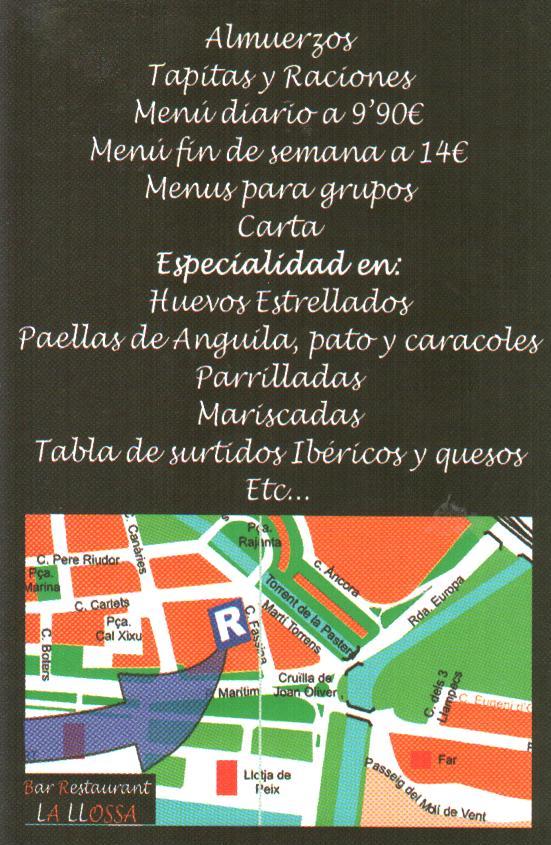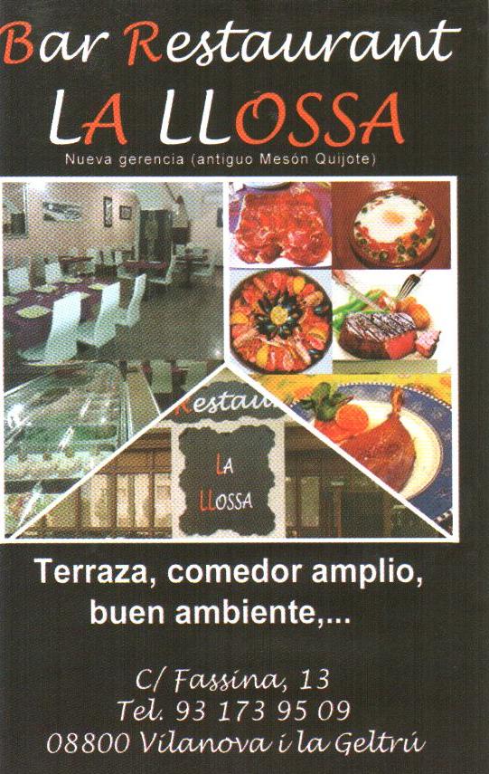 Bar Restaurant La Llossa, está situado en la Calle Fassina nº 13, esquina con Calle Carlets, en el Barri de Mar de Vilanova i la Geltrú, hermosa y familiar población de la Costa de la Comarca del Garraf. Nuestra proximidad con la Playa del Faro, a apenas 100 metros, hace que se pueda combinar playa y comida en un espacio poco distante entre sí.